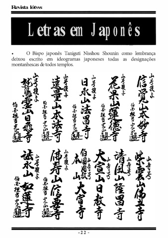 Revista lótws Letras em J a p o n ê s • O Bispo japonês Taniguti Nisshou Shounin como lembrança deixou escrito em ideogramas japoneses todas as designações montanhescas de todos templos. - 2 2 -